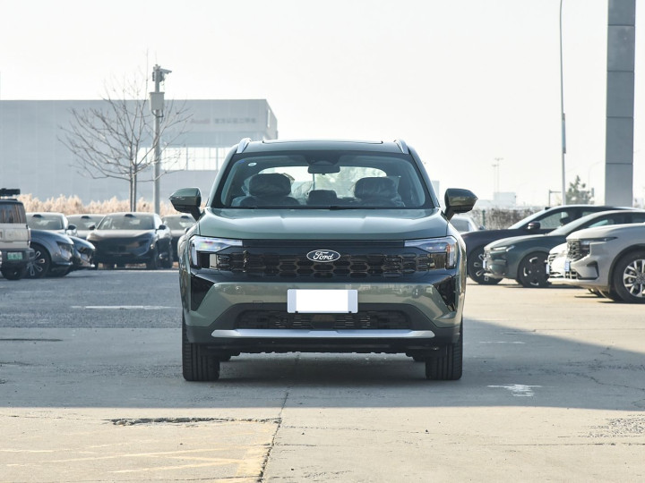 我们首先来看新车的外观设计方面,领睿的车头设计完美诠释了 “力量感与精致感并存”。作为福特纵横家族成员,它沿用了方正挺拔的引擎盖线条,搭配贯通式黑曜石前格栅,横向拉伸的视觉效果让 1935mm 的车宽优势一目了然,彰显中型 SUV 的体量感。格栅内部的蜂窝状纹理经过熏黑处理,与两侧 L 型星耀 LED 大灯无缝衔接,点亮后形成犀利光带,夜间辨识度极高。前保险杠采用大梯形设计,底部银色护板不仅强化硬派气质,更能在非铺装路面行驶时抵御碎石撞击,兼顾美观与实用。雾灯区域以镀铬饰条勾勒轮廓,与格栅饰条形成呼应,提升精致度。